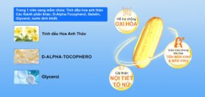 | Thành phần | Tinh dầu hoa anh thảo. Các thành phần khác: D-Alpha-Tocopherol, Gelatin, Glycerol, nước tinh khiết |