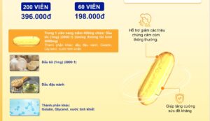 | Thành phần | Trong 1 viên nang mềm 400mg chứa: Dầu tỏi (1mg) (3000:1) (tương đương tỏi tươi 3000mg), thành phần khác: dầu đậu nành, Gelatin, Glycerol, nước tinh khiết. |